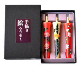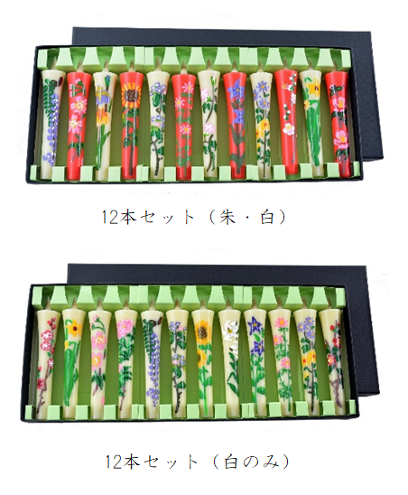 手描き絵ろうそくは、3本セットの「春」「夏」「秋」「冬」と、12本セットの「朱・白」「白のみ」の “6種類” がございます。