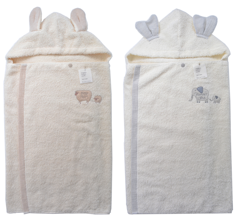 ヒツジとゾウをモチーフとした愛らしい耳がポイントのフード付きバスタオル。胸元にはそれぞれのモチーフに合わせた肌触りの良いアップリケ刺繍が施されています。ベースカラーは、ヒツジはベージュ、ゾウはアイボリーと、ナチュラルな色合いでやさしい雰囲気に仕上がっています。ジェンダーレスなデザインで、出産祝いなどの贈り物にもおすすめです。
