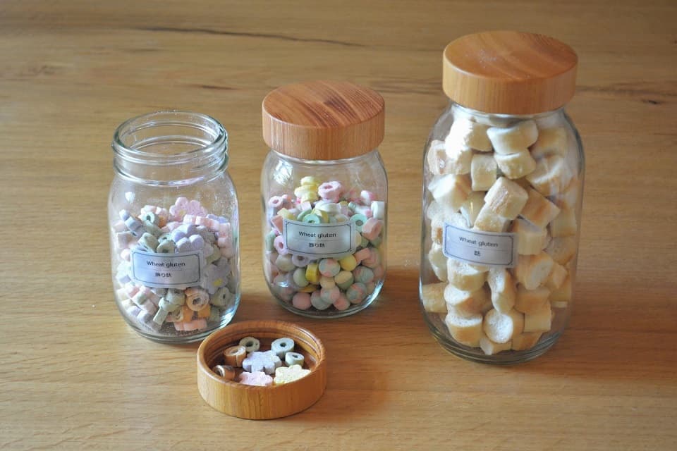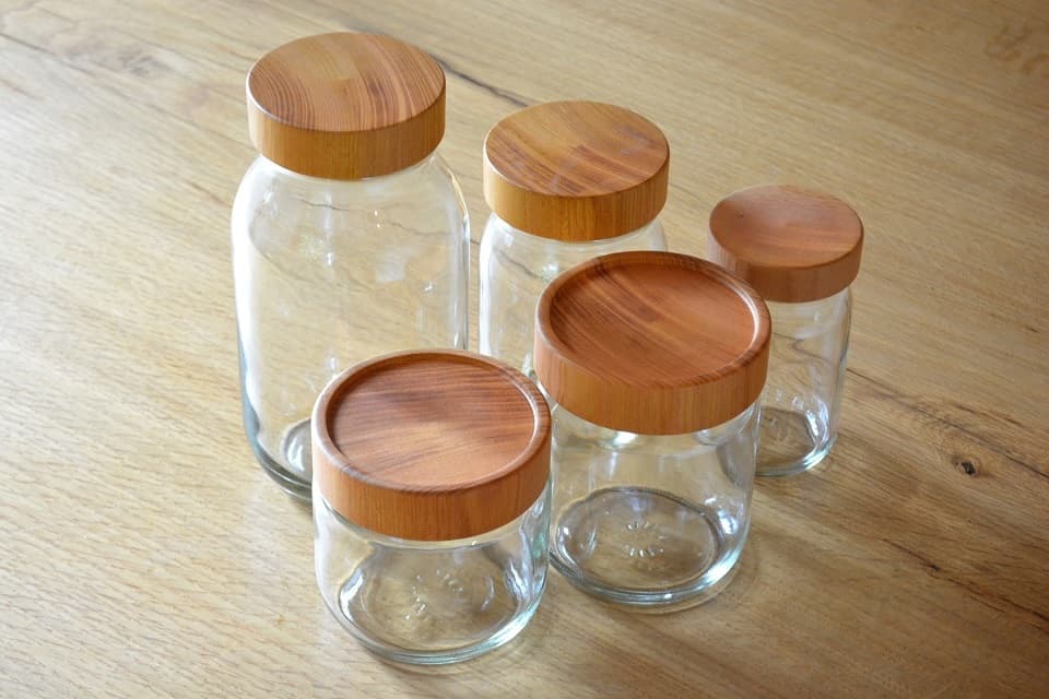 食品用ガラス瓶に、木目が美しいケヤキの蓋を合わせています。石川県山中の木工ろくろの技術が活かされた精巧なネジ切り加工により、開閉はとってもスムーズ。