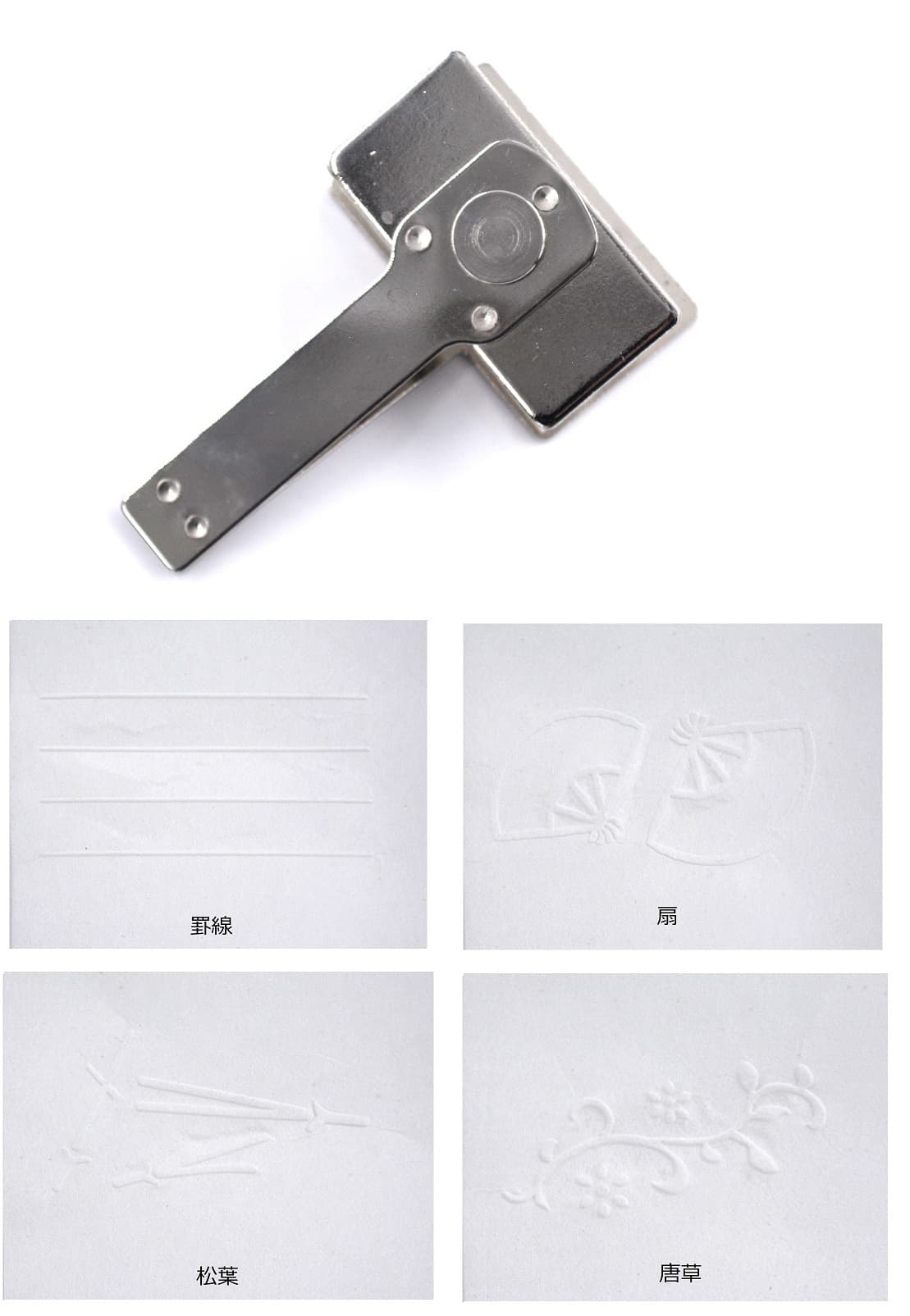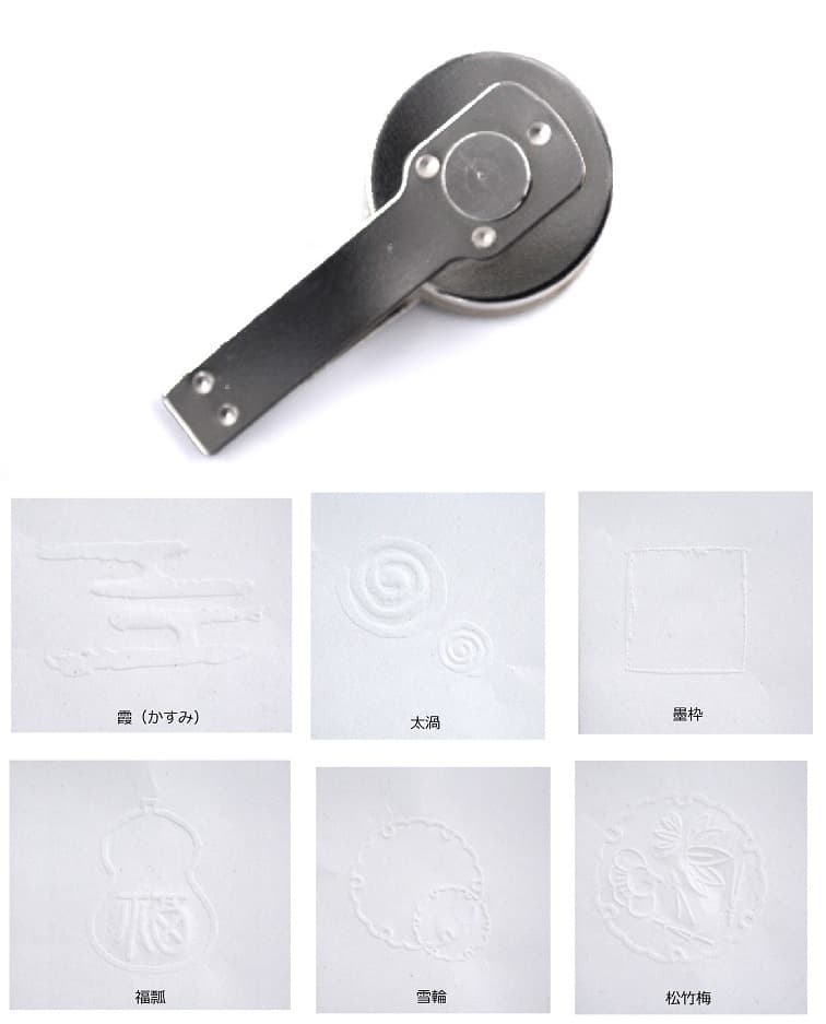 エンボッサーは、ハンコと違ってインク汚れの心配がないので、懐紙にもおすすめです。「唐草文」エンボッサーは、くっきりとした陰影が美しくやさしい雰囲気に仕上がります。「霞」エンボッサーは、一押しで和の雰囲気が漂い、奥行感が出せます。
