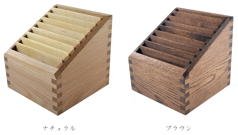 9つに分かれた収納部分の間隔は約1cm。ハガキなら30枚程入ります。横幅は13cmで、メモ帳やCDも収まります。底板は斜めに取り付けられて階段構造になっているので、収納部分の深さは全て同じ約8cmになります。深さが揃っているので目当ての物を探しやすく、取り出しやすいデザインになっています。