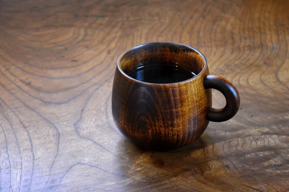 木のぬくもりあふれるマグカップ。なめらかな木肌に波紋のように広がる穏やかな木目、そして、ころんと丸みを帯びた柔らかなフォルムにホッと心が和みます。無垢材ならではのあたたかな手触りが心地良く、手のひらにやさしく馴染みます。