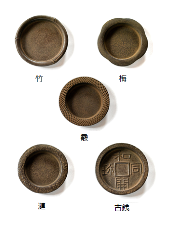 左から時計回りに、梅・漣 (さざなみ)・古銭・竹・霰の全5種類。
