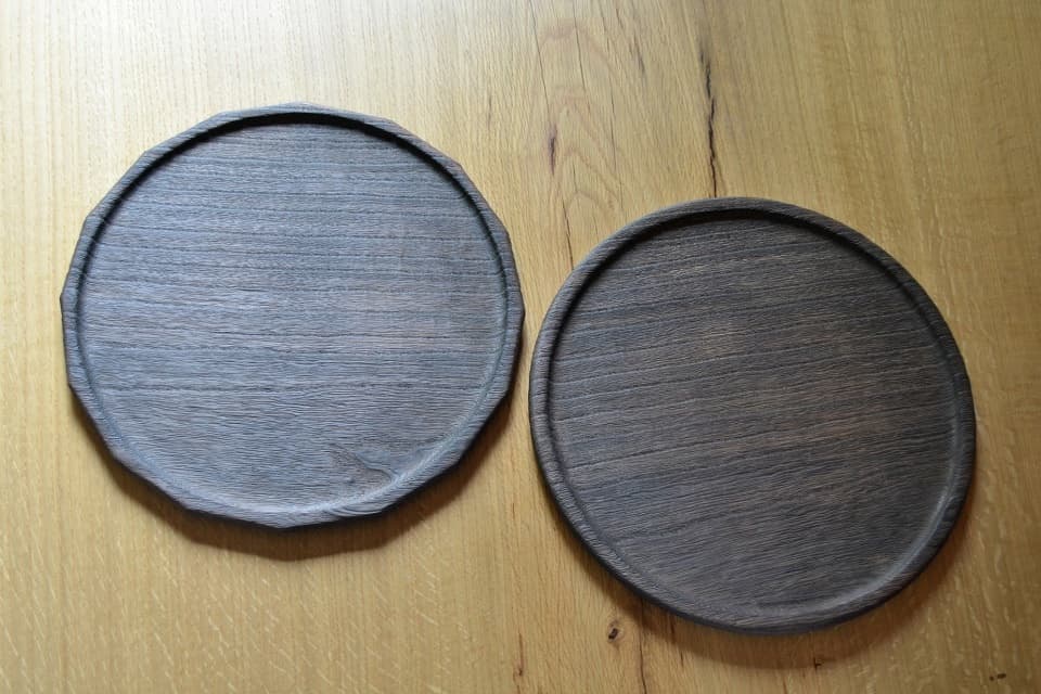 素材の風合い引き立つシンプルな「丸盆」と、十六角に削って形を整えた「十六角盆」の2種類ございます。