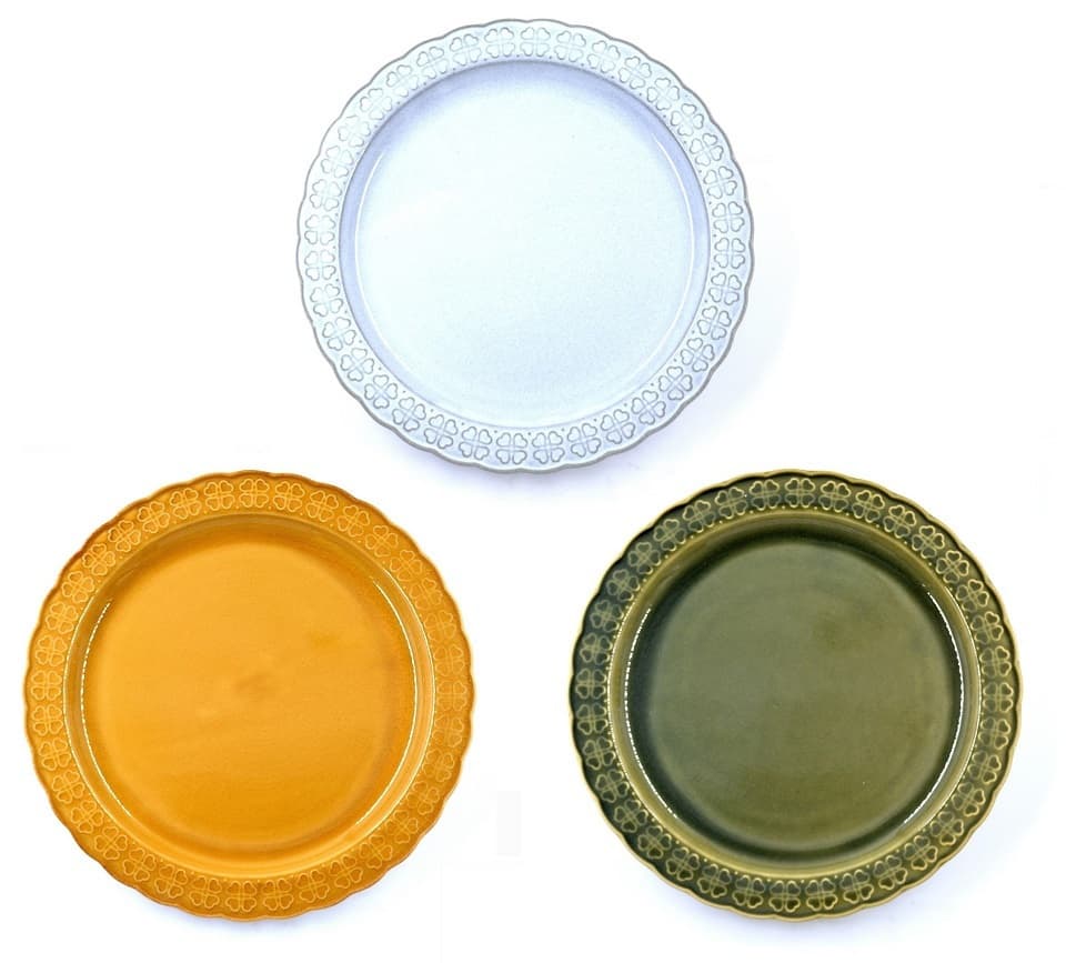 プレートの縁には、四葉のクローバーをモチーフにエンボス加工が施されています。フリルのように柔らかく波打ったシルエットと相まって、やさしく穏やかな印象です。