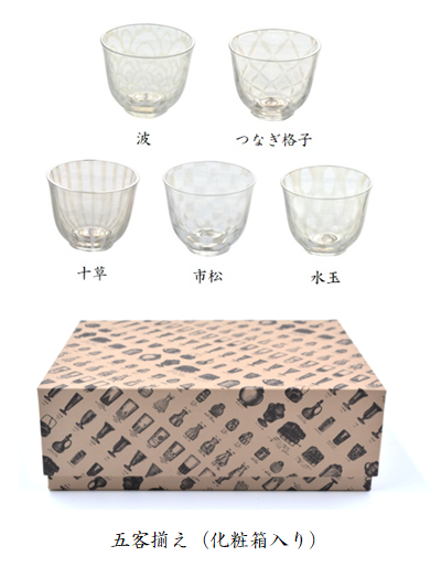 各柄が一つずつ納められた「五客揃」は、グラスが5つ並ぶ長い化粧箱入りですので、贈り物にもおすすめです。
