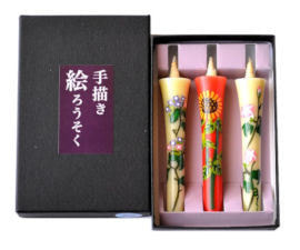 手描き絵ろうそくは、3本セットの「春」「夏」「秋」「冬」と、12本セットの「朱・白」「白のみ」の “6種類” がございます。